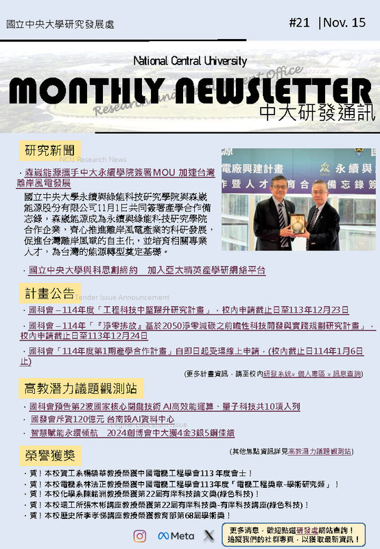 國立中央大學永續與綠能科技研究學院與森崴能源股份有限公司11月1日共同簽署產學合作備忘錄,森崴能源成為永續與綠能科技研究學院合作企業,齊心推進離岸風電產業的科研發展,促進台灣離岸風電的自主化,並培育相關專業人才,為台灣的能源轉型奠定基礎。