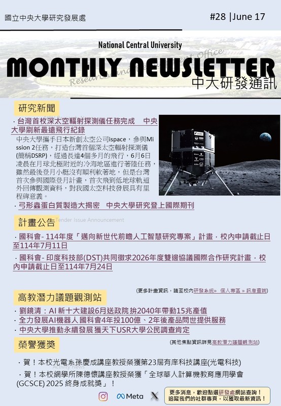 中央大學攜手日本新創太空公司ispace,參與Mission 2任務,打造台灣首個深太空輻射探測儀(簡稱DSRP),經過長達4個多月的飛行,6月6日凌晨在月球北極附近的冷海地區進行著陸任務,雖然最後登月小艇沒有順利軟著地,但是台灣首次參與國際登月計畫,首次飛到低地球軌道外回傳觀測資料,對我國太空科技發展具有里程碑意義。