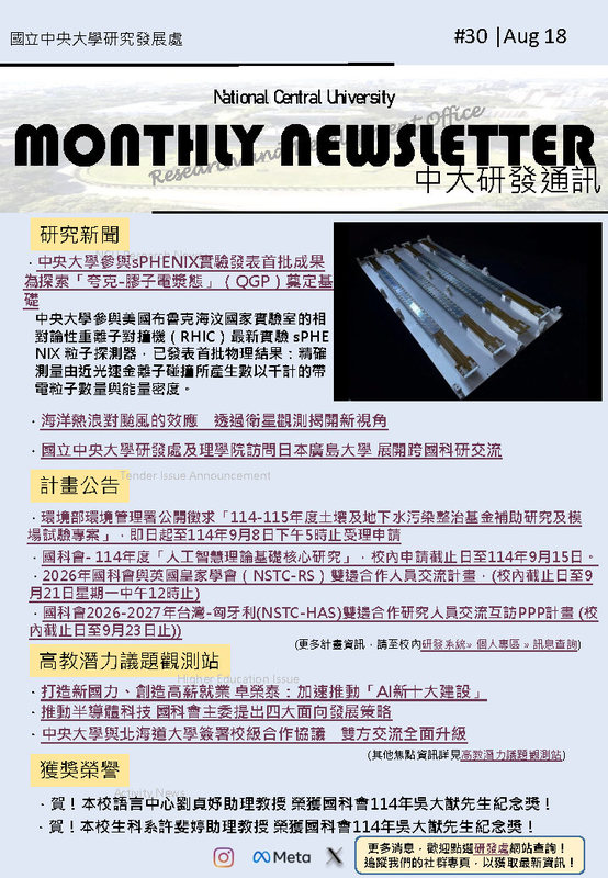 中央大學參與美國布魯克海汶國家實驗室的相對論性重離子對撞機(RHIC)最新實驗 sPHENIX 粒子探測器,已發表首批物理結果:精確測量由近光速金離子碰撞所產生數以千計的帶電粒子數量與能量密度。