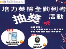 114-1中央大學辦理培力英檢全勤到考抽獎活動 114-1學期本校大一到大四生參加完聽讀說寫四項考試即符合抽獎資格;大獎iphone15一支(25900元),二獎Apple Watch SE一個 (7900元),三獎AirPods 4一個 (4490元),以及全家二百元禮券共30名。