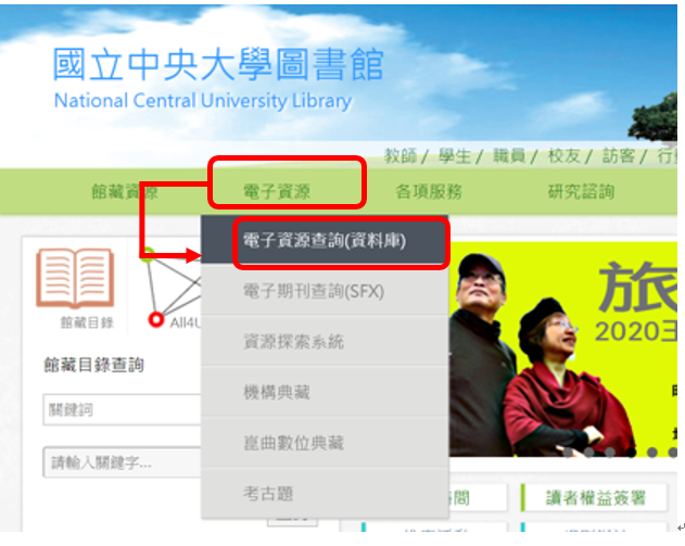 1、點選 「電子資源」及「電子資源查詢(資料庫)」-->輸入帳號與密碼,如下圖。