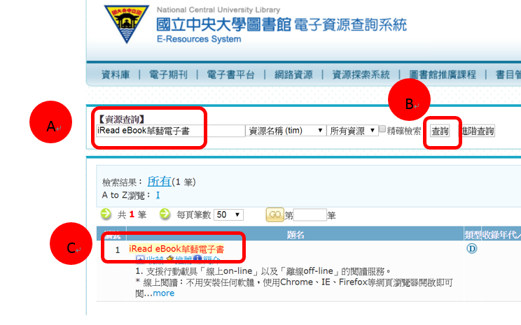 2、A.輸入"iRead eBook 華藝電子書",B.點選”查詢”、C點選"題名"。-->註冊帳號: 請先點選「登入」,如下圖。
