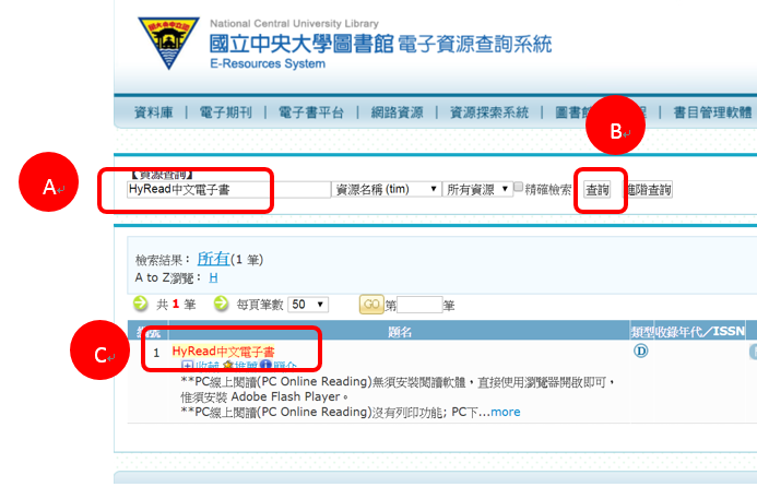 2、A.輸入"HyRead 中文電子書",B.點選”查詢”、C點選"題名"。--> 請先點選「登入」,輸入中大圖書館借書帳密,如下圖。