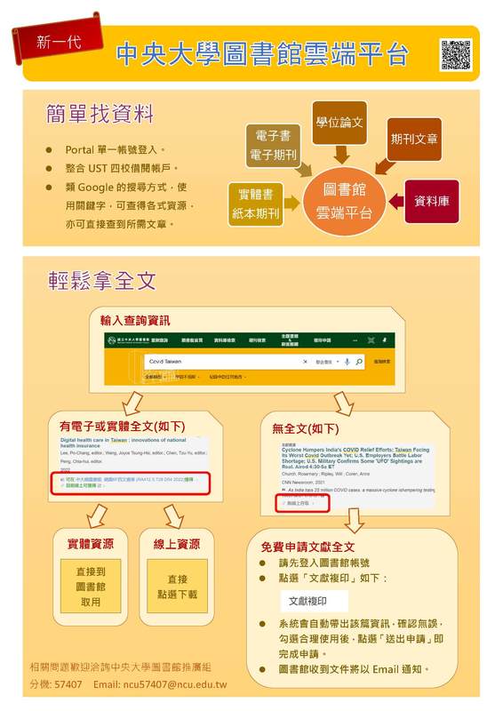 圖書館雲端服務平台(Alma系統):此系統最大特色在於一站式服務,整合各種資源類型(紙本及數位),提供使用者簡單、優化的檢索功能。不論是使用借還書(台聯大代借代還)、查找資料、下載全文都更加方便使用。 ~~您一定來試試看唷~~ 點我進入系統