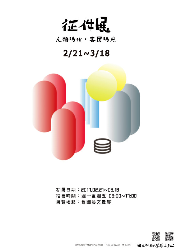 桃園正好位處客、閩、原民文化匯集的精華地帶,桃園地區也居住了來自各國新移民的訪客,造就出桃園多元的生活文化。此次徵件展覽以「人類時代--客居時光」為主題,邀請大家來看素人創作者在桃園的生活記憶,也邀請大家票選心中目首選的作品,還有機會獲得藝文中心獨特小禮品。