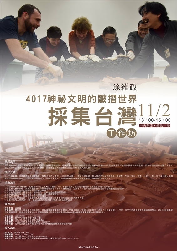 以「台灣之眼」在涂維政的引導下進行「採集工作坊」遙想「4017年的台灣」。邀請民眾參與,每人提供約10-15個物件,從貨幣、生活、文化、飲食、社會……對「4017年台灣」這個概念提出相關的物件,以物件壓印於陶土上,再倒入人造石,取得物件模型後涂維政將其製成之後作品的某一部分。