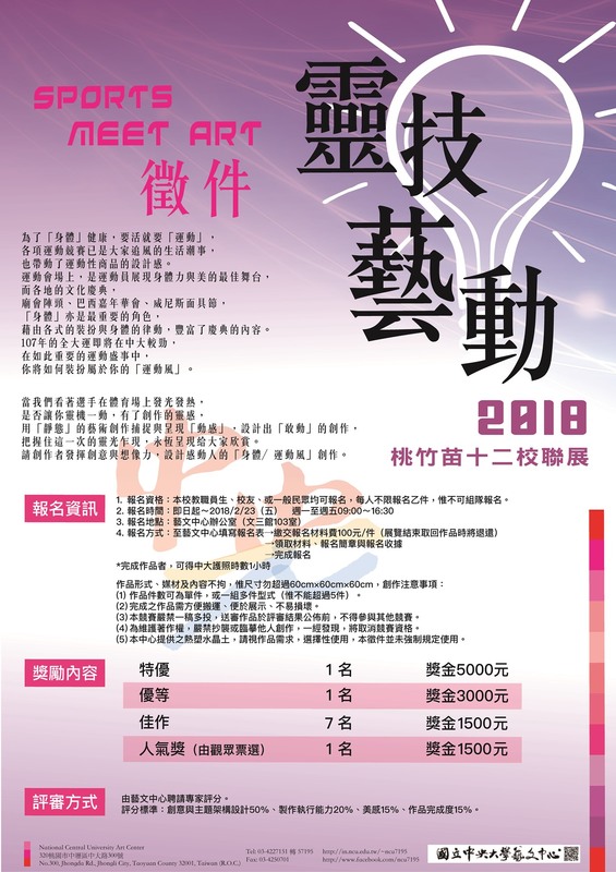 為了身體健康,要活就要「運動」,全球性或區域性的運動競賽亦是大家追風的生活潮事,中央大學將主辦2018全國大專運動會,此次將結合「身體、運動」與「藝術」,共同促成此次全國大學生的重要慶典。運動會上,是展現身體力與美的最佳舞台,當我們看著運動選手在體育場上發光發熱,是否讓你靈機一動,有了創作的靈感,將這一刻的感動或創意,能永恆呈現給大家欣賞。