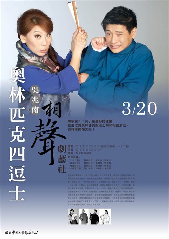 吳兆南相聲劇藝社,成立於1999年,由「人間國寶」吳兆南大師親自指導,是台灣說唱藝術暨戲劇、傳統戲曲表演團隊,自民國一百年起,陸續推出《百年相聲.起藝吧!》、《侯門深似海》、《相聲憂末日?幽默日!》、《相聲.愛你一生》…等「主題式」系列相聲專場,獲得全國觀眾熱烈支持,不但在校園、商演中獲得廣大迴響,更創造台北、新竹、台中、嘉義公演幾近秒殺的票房紀錄,並受邀至美國、馬來西亞巡迴演出,在僑界造成轟動。2018年,中央大學主辦的全大運是高等院校年度盛事,在揮灑熱血青春之餘,輕鬆幽默的相聲也是有益身心的活動,其實相聲演員也可以算是頂尖運動員,只不過練習的肌肉群有些集中─光練一張嘴了!專家指出:「笑」才是最好的運動,歡迎大家一同欣賞奧林匹克四逗士精彩演出,逗得您開懷大笑!