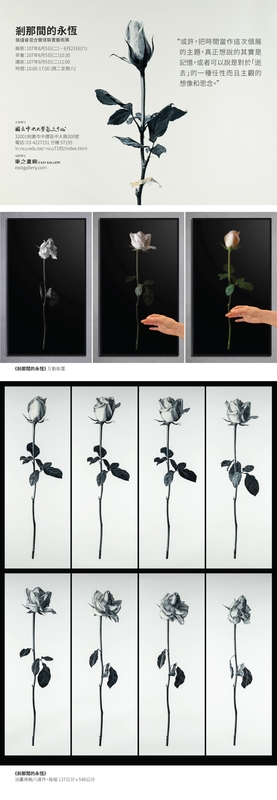 葉謹睿表示,《剎那間的永恆》起始於父親健康惡化所帶來的心理衝擊。大型油畫裝置部分,透過儀式化的創作方式,精細地描繪玫瑰由綻放乃至於凋謝的過程。透過專注和重複性,來尋求心境上的避風港。而互動媒材部分,葉謹睿選擇以3D動態偵測技術,讓觀者必須以拇指與食指結「說法印」,才能啟動象徵「貪執」和「虛妄」的兩件數位媒材作品。藝術家表示,這個特別的互動設計,主要是希望透過觀者的肢體參與,來強調對於虛無和逝去感的體悟。