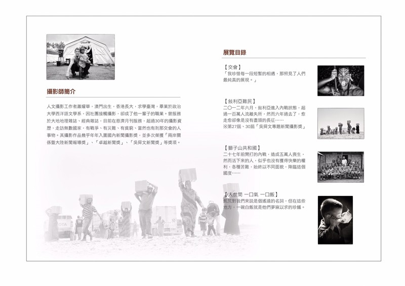 此次展出包括四個系列「交會」、「第27、30屆吳舜文專題新聞攝影獎系列作品──敘利亞難民」、「伊波拉-獅子山」、「人世間 一口氣 一口飯」。「交會」系列,述說著攝影師蕭耀華在旅途上與影像中人物的短暫相遇,以鏡頭照見人物的純真;「敘利亞難民」、「伊波拉-獅子山」系列,是他近年隨慈濟出訪,對國際社會事件難民及伊波拉病毒的紀錄;「人世間 一口氣 一口飯」系列,則是攝影師希望藉由獅子山、中國等地的饑荒,使觀者反思及珍惜,身處台灣所擁有的生活。過攝影的窗口,蕭耀華試圖激起觀者,對不熟知社會、世界的更多關懷。