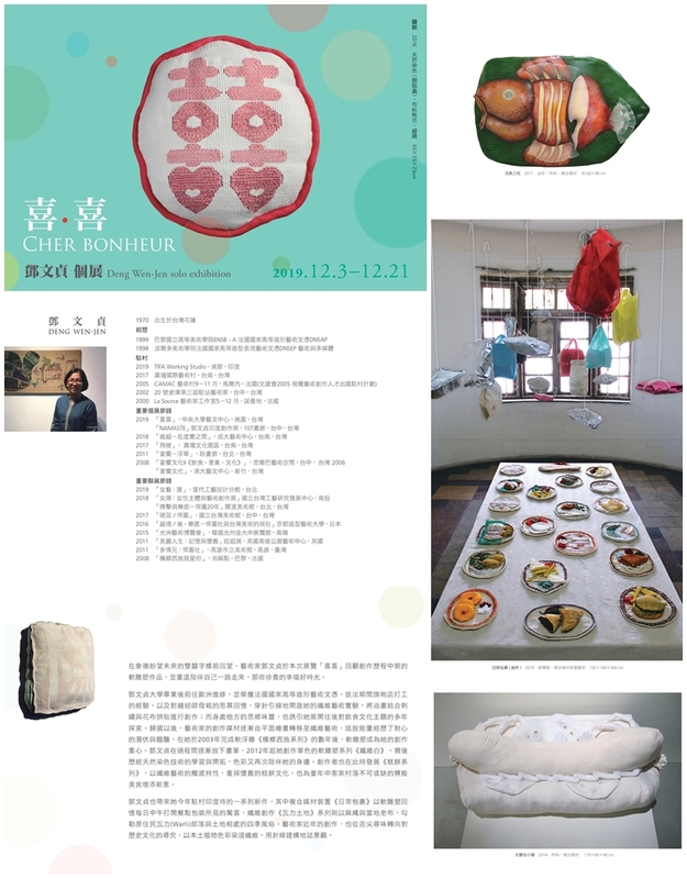 鄧文貞是台灣從事纖維藝術和軟雕塑的少數先驅者,她畢業於法國巴黎高等美術學院畢業後,並為台灣當代藝術史脈絡中重要藝術家團體「悍圖社」的唯一女性成員。旅法期間旗袍店打工的經驗,以及對縫紉師母親的思慕回憶,穿針引線地開啟她的纖維藝術實驗,將油畫結合刺繡與花布拼貼進行創作;而身處他方的思鄉味蕾,也誘引她展開往後對飲食文化主題的多年探索。歸國以後,藝術家的創作媒材逐漸由平面繪畫轉移至纖維藝術,這股能量經歷了耐心的潛伏與醞釀,在她於2003年完成軟浮雕《檳榔西施系列》的數年後,軟雕塑成為她的創作重心。鄧文貞在過程間逐漸放下畫筆,2012年起她創作單色的軟雕塑系列《纖維白》,爾後歷經天然染色技術的學習與開拓,色彩又再次陪伴她的身邊。創作者也在此時發展《糕餅系列》,以纖維藝術的觸感特性,重探懷舊的糕餅文化,也為童年中傳統客家村落不可或缺的粿粄美食增添新意。