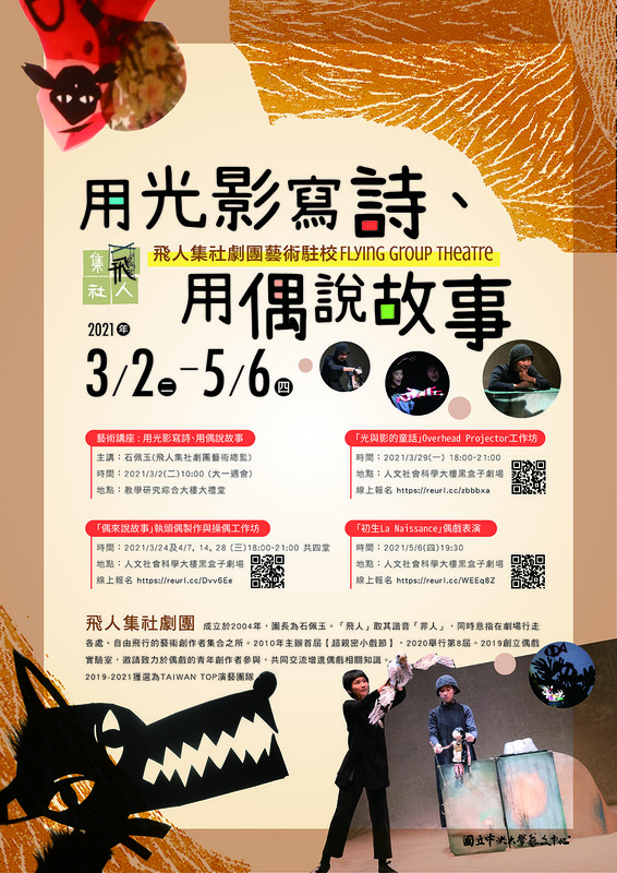 ◎飛人集社劇團成立於2004年,團長為石佩玉。「飛人」取其諧音「非人」,同時意指在劇場行走各處、自由飛行的藝術創作者集合之所。飛人將偶的定義放到最大,希望能透過「操作」「運用」讓「沒有生命的物件(包括戲偶)」可以傳遞戲劇情感,以小寓大,以實踐「無物不成偶」之境界。2010年主辦首屆【超親密小戲節】,2020舉行第8屆。2019創立偶戲實驗室,邀請致力於偶戲的青年創作者參與,共同交流增進偶戲相關知識。2019-2020獲選為TAIWAN TOP演藝團隊。