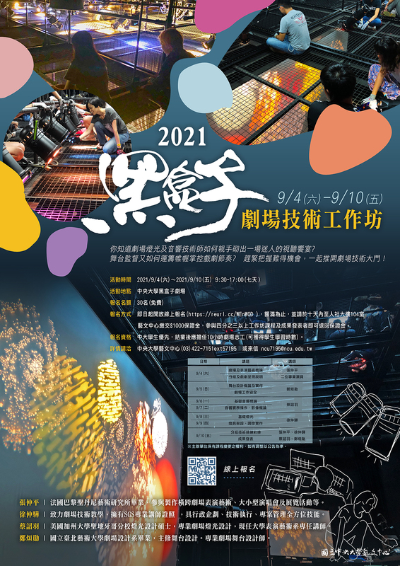 ● 報名方式:即日起開放線上報名(https://reurl.cc/WEnWOD ),額滿為止,並於活動前至人文社會科學大樓104室藝文中心繳交$1000保證金,參與四分之三以上工作坊課程及成果發表者即可退回保證金。