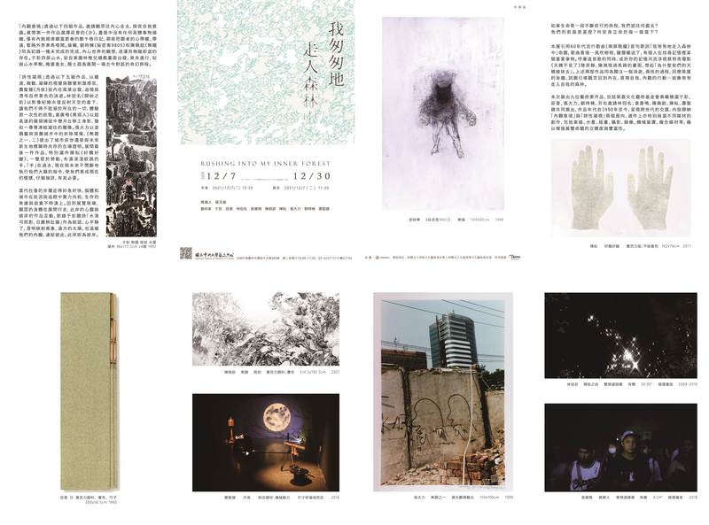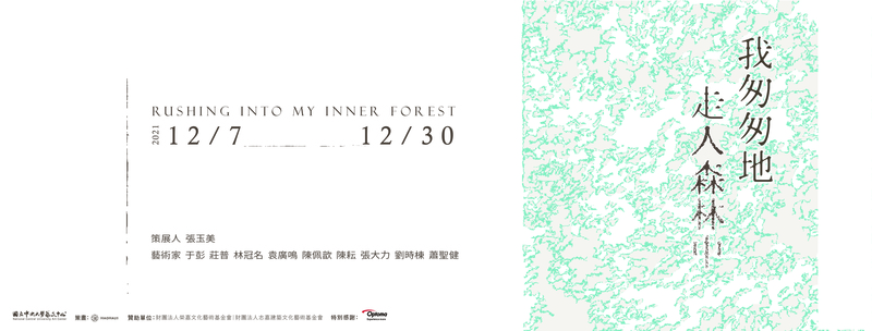 「我匆匆地走入森林中」(Rushing into My Inner Forest)一展,是本中心首次與「好思當代」合作,並由張玉美擔任策展人,集結當代九位藝術家的作品參展,包括榮嘉文化藝術基金會典藏精選于彭、莊普、張大力、劉時棟,另也邀請林冠名、袁廣鳴、陳佩歆、陳耘、蕭聖健共同展出,展期從2021年12月7日至12月30日。