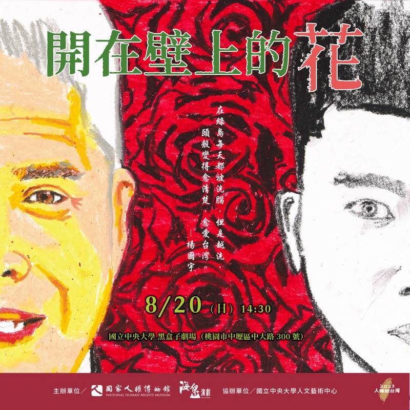 海島演劇2023人權遊台灣《開在壁上的花》劇作是以政治受難者楊國宇前輩的經歷為中心,延伸述說了簡國賢、林秋祥、陳顯宗、呂沙棠、施教爐、黃鼎實、簡士性等受難者的故事,展現出白色恐怖時代下的人物命運及社會寫照,真摯樸實的情感和台語演出,將發生在這片土地的故事,活生生地呈現。