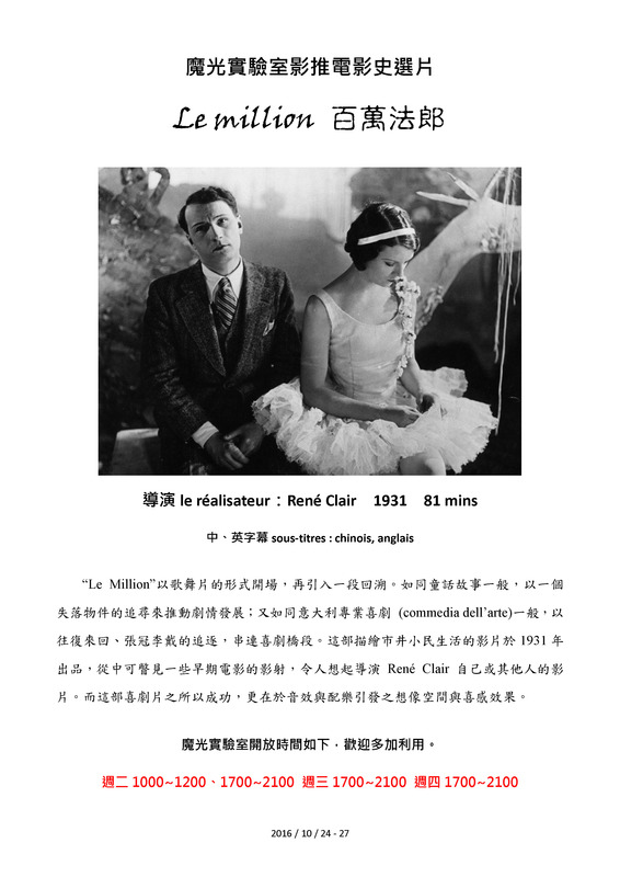 本期焦點 台灣與魁北克兩相映照/魁北克電影人訪台座談會20161024-27魔光實驗室影推電影史選片 : Le million 百萬法郎小偷小摸的四十大盜 40 Voleurs à la petite semaine | 葛尹風個展+新書分享 |