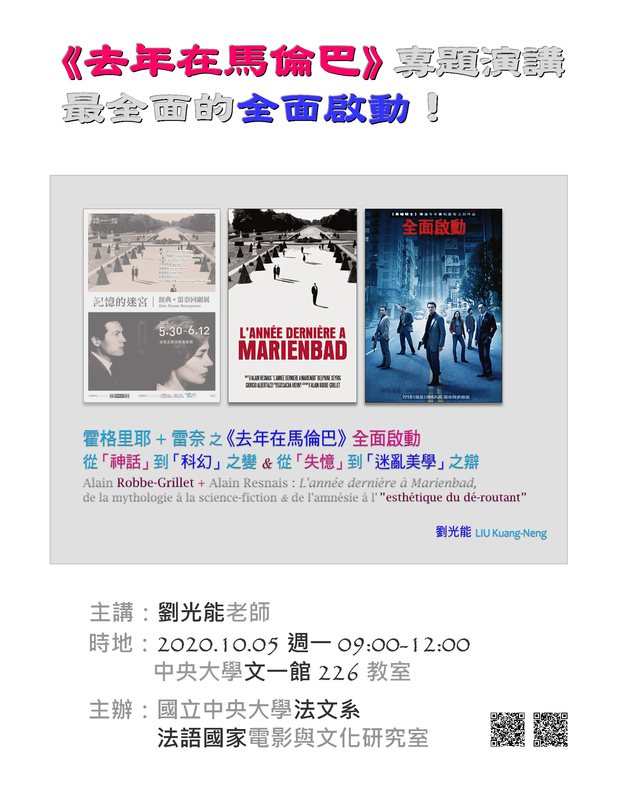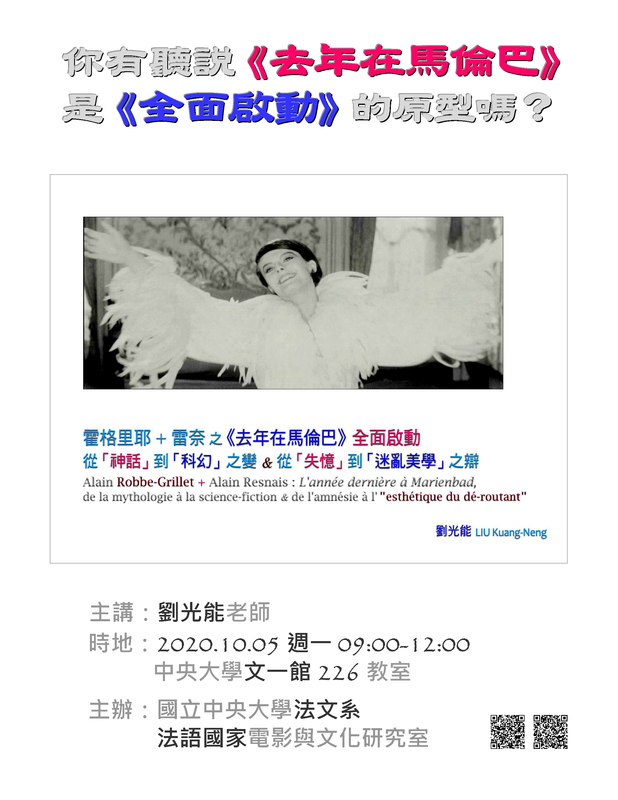 1.《去年在馬倫巴》專題演講‧最全面的全面啟動 主講:劉光能老師 時間:2020年10月5日 週一 09:00-12:00 地點:文一館A226教室