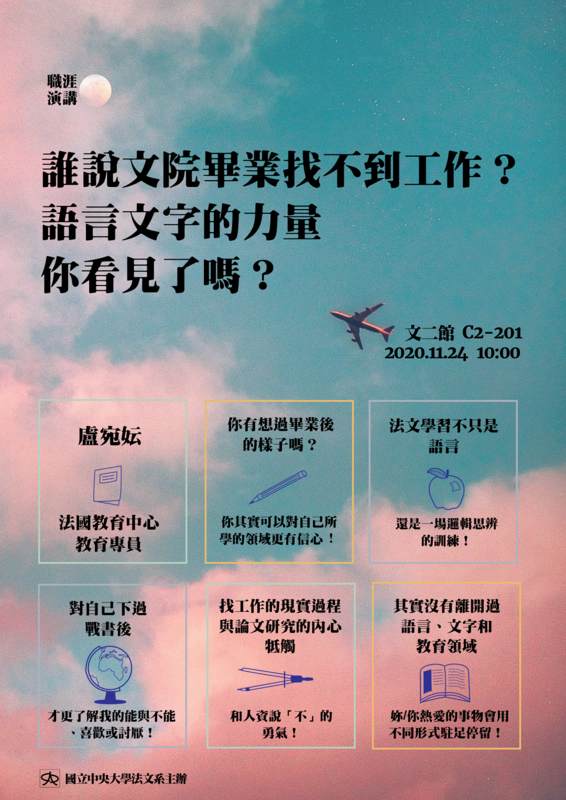 1.【職涯演講】誰說文院畢業找不到工作?語言文字的力量 你看見了嗎? 講者:盧宛妘 法國教育中心教育專員 / 系友 時間:2020年11月24日 週二 10:00-12:00 地點:文二館C2-201教室 講綱重點: 你有想過畢業後的樣子嗎? 你其實可以對自己所學的領域更有信心! 從學習法文到實際應用、從大學交換生到申請法文研究所、從比利時雙聯計劃到完成論文研究、從台灣教育部到法國教育中心,本場講座,講者將以自身學經歷分享對於求學、求職的過程、工作歷程,以及對於法語學習帶來的收穫。 * 法文學習不只是語言,還是一場邏輯思辨的訓練! * 對自己下過戰書後,才更了解我的能與不能、喜歡或討厭! * 找工作的現實過程與論文研究的內心牴觸,和人資說「不」的勇氣! * 其實沒有離開過語言、文字和教育領域 — 妳/你熱愛的事物會用不同形式駐足停留! 歡迎對未來職涯規劃充滿好奇或感到毫無頭緒的同學參加此次校友分享講座,讓我們開啟法文應用、未來發展的深入對話!