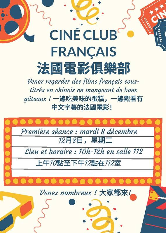 6. 法國電影俱樂部 我們的法語助教Naomi舉辦的活動 ⁽˙³˙⁾◟(๑•́ ₃ •̀๑)◞⁽˙³˙⁾ 第一場12月8日10:00-12:00在C2-112教室~