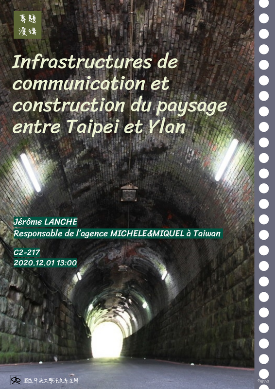 講者:Jérôme LANCHE 藍傑鴻 Responsable de l’agence MICHELE&MIQUEL à Taiwan 時間:2020年12月1日(二)13:00-15:00 地點:文二館C2-217 講綱:Dans cette intervention, nous traiterons dans un premier temps de la façon dont les infrastructures de transport et de communication modifient depuis le début du XIXème siècle les rapports spatio-temporels, mais aussi sensoriels et cognitifs au paysage, et forgent une certaine perception du territoire dans les montagnes du Nord-Est de Taiwan. Dans un deuxième temps, à travers la présentation d’un projet d’infrastructure conçu par Michèle&Miquel : la piste cyclable à travers les anciens tunnels de Sandiaoling et le long des gorges de Keelung River, nous tenterons de mettre en évidence les enjeux et défis de toute intervention contemporaine sur le paysage à Taiwan.