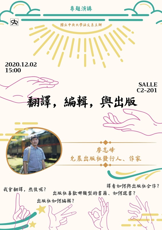 3.【專題演講】翻譯,編輯,與出版 講者:廖志峰 允晨出版社發行人、作家 時間:2020年12月2日 週三 15:00-17:00 地點:文二館C2-201 「法譯中(二)」課程邀請允晨出版社發行人廖志峰先生至本系演講,分享他多年來編輯與出版的經驗,歡迎同學前往聆聽。