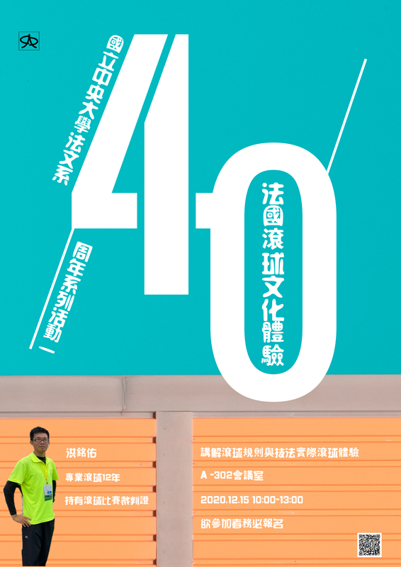 明年!就是!法文系創系40周年啦 ₊˚‧(๑σ̴̶̷̥́ ₃σ̴̶̷̀)·˚₊⁽⁽٩(๑˃̶͈̀ ᗨ ˂̶͈́)۶⁾⁾✧*。٩(ˊᗜˋ*)و✧*。 慶祝活動第一波是 ♫ 打搭搭啦搭 ♫ ♫ 法國滾球活動pétanque ◦○ ◯ ● 我們邀請到接觸滾球12年的滾球大師洪銘佑先生來為大家介紹滾球規則與技法,洪大師除了豐富的滾球經驗外還持有台灣滾球裁判證、是各大社團的指導教練、滾球委員會顧問.....太多身分了,請大家演講時好好體會(ง •̀_•́)ง 滾球活動有2部分: 第1部分:「滾球規則與技法講解」
