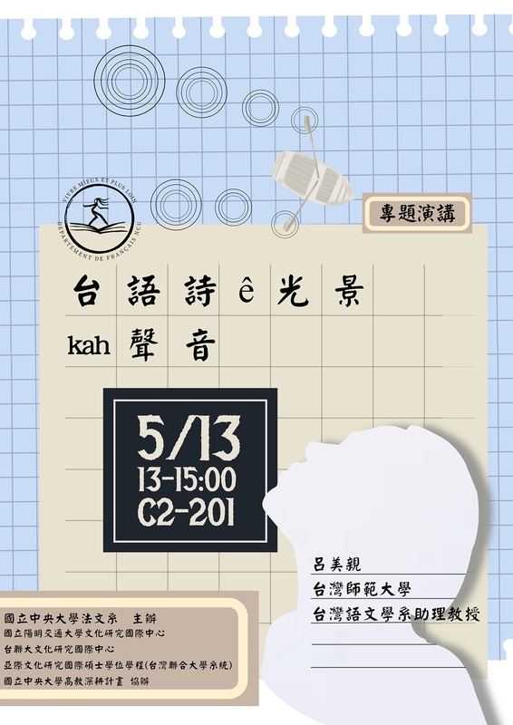 3. 專題演講|台語詩ê光景kah聲音 講者:呂美親 台灣師範大學台灣語文學系助理教授 時間:2021年5月13日 週四 13:00-15:00 地點:文二館C2-201教室 講綱重點: 從戰前和戰後,台灣人經歷過兩次「國語教育」,國語不斷內建在台灣人的身體,取代了原來的母語。母語不僅越來越不被言說,長期以來也被認為無法書寫。講「台語」(狹義指福佬話)的台灣人雖「曾」是佔人口比例最多數,所留下的文學作品仍是遠遠不及「國語」的數量。母語,似乎成為我們「最熟悉的陌生人」。 不少作家與詩人,為了把母語的生命拉長,為了再拉近與母語的距離,他們從「詩」開始,喚醒母語在台灣人心底的情感與記憶。即便如此,母語從新世代的身體抽離的速度更是驚人,母語的土壤也只會越來越貧瘠,它需要更多人一起灌溉。 一起灌溉母語花園之前,先來看看這百年來幾首不可錯過的台語詩風景,聽聽它們美麗的聲音吧!